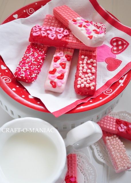 J’adoooore les biscuits gaufrettes, ceux-là sont vraiment jolis!Une collation sucrée-salée avec des bretzels trempés et décorés de petits bonbons.Des guimauves blanches ou à la fraise, trempées dans du chocolat et décorées de petits bonbons. (Guimauve + chocolat = miam!)