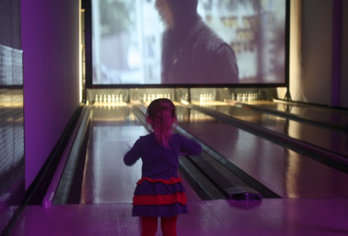 Tout d’abord, nous avons pu démontrer notre énorme talent (ou pas!) de joueurs de bowling. On joue aux petites boules dans une ambiance super avec écran géant, musique, éclairage de party. Des racks sont disponibles pour les tout-petits qui auraient plus de difficulté à enligner leur boule. Ça fonctionne tellement bien que ma 3 ans a fini deuxième au pointage.