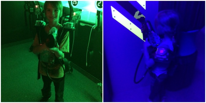 C’est en après-midi qu’on a essayé le lasertag. Les grands étaient déjà vendus d’avance, mais c’est la première fois que les filles pouvaient vivre cette expérience. L’équipement étant un peu lourd, notre plus jeune s’est accroché à nous et a plutôt utilisé notre fusil. Cocotte, qui a 4 ans, mais une shape de 5-6 ans, a trouvé ça lourd en l’enfilant, mais une fois le fun commencé, elle ne le sentait plus du tout. Elle était aussi un peu stressée d’entrer dans la salle éclairée avec des blacklights, mais elle a vite pris son aise et se baladait toute seule. On a eu bien du plaisir à se promener, se cacher et tirer sur l’équipe adverse dans la salle de jeu.
