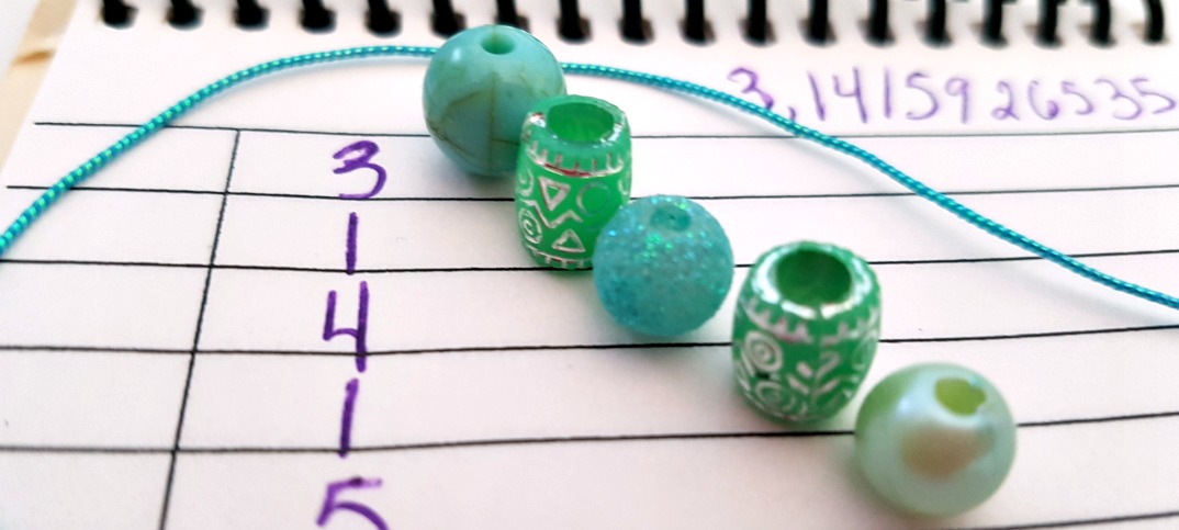 Écrivez le nombre Pi et attribuez une perle de couleur ou motif différent à chaque chiffre. Enfilez ensuite les perles dans le bon ordre sur une ficelle! Vous pouvez faire un bracelet ou même un collier! Ça fait une belle activité de motricité fine, ça donne une belle occasion aux enfants de reconnaitre les chiffres et bien entendu, ça donne une introduction au nombre Pi!