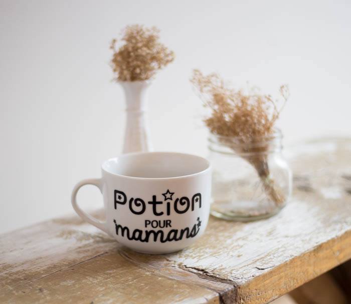 Au moment d’écrire ces lignes, il y a 19 modèles différents, ce n’est pas rien! Genevieve s’est choisi le modèle qui dit « Potion pour mamans ». Sa tasse est jolie, n’est-ce pas?