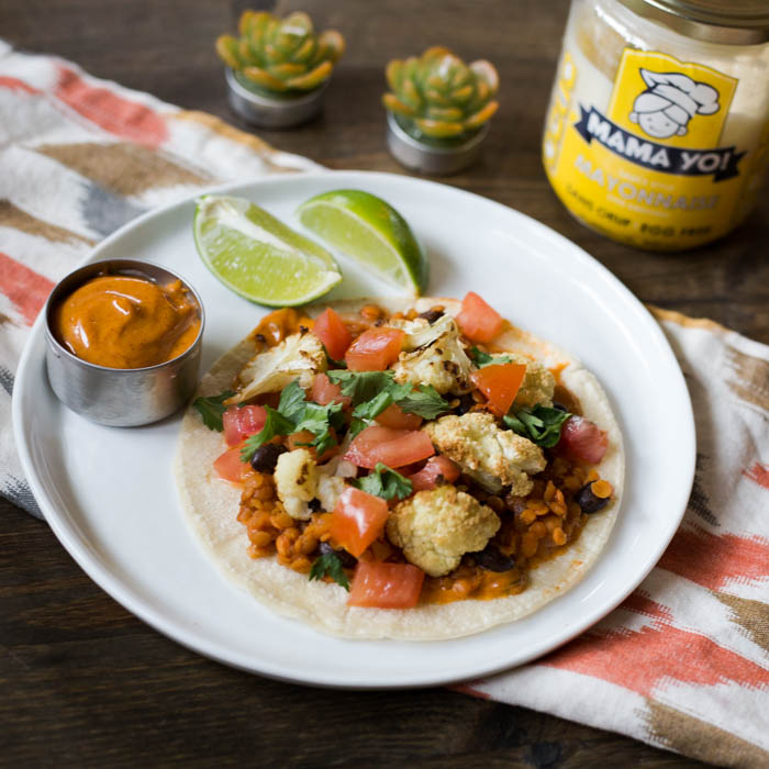 Tous ces gens peuvent être réunis à la même table avec ces tacos au chou-fleur, lentilles et haricots noirs avec la merveilleuse mayonnaise sans œufs de Mama Yo!