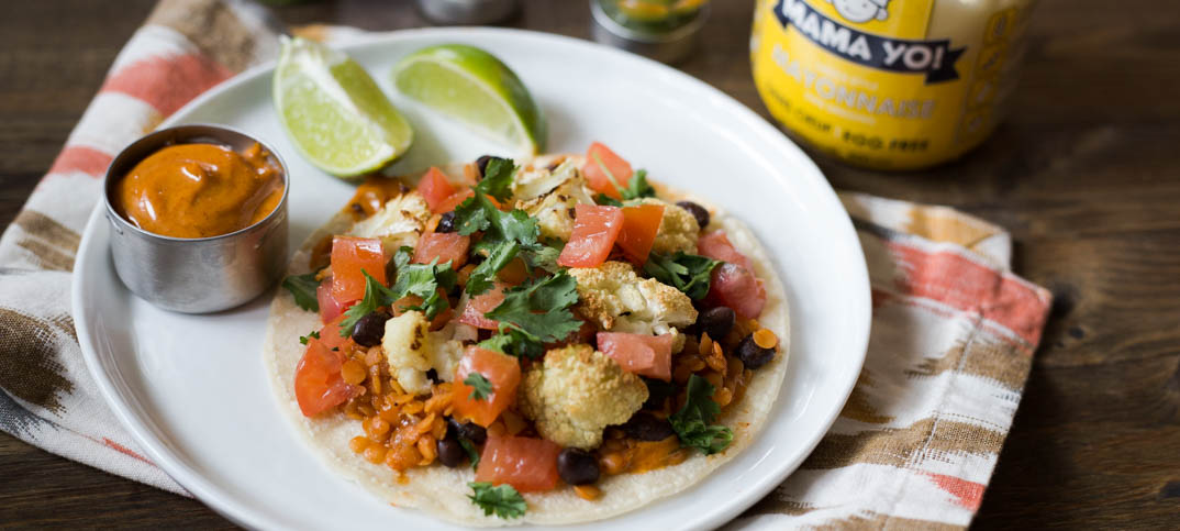 Tous ces gens peuvent être réunis à la même table avec ces tacos au chou-fleur, lentilles et haricots noirs avec la merveilleuse mayonnaise sans œufs de Mama Yo!