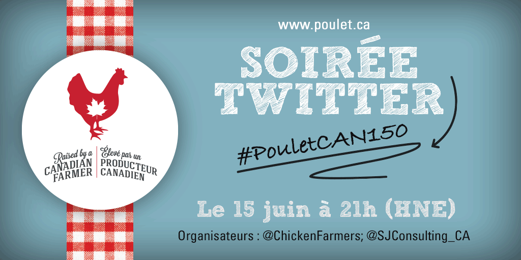 Réserver votre soirée du 15 juin et venez jaser avec nous! Suivez les hashtags #CDNchicken150 et #PouletCAN150 ainsi que les comptes de @ChickenFarmers et @SJConsulting pour participer à la conversation. Comme toujours, dans nos Twitter partys, il y a des prix à gagner!!!