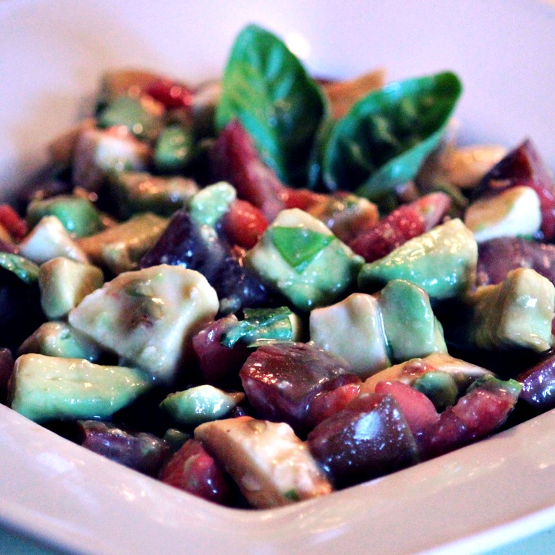 De plus, en plus d’être à mon goût, cette salade augmente beaucoup mon apport quotidien de vitamines et minéraux: l’avocat étant une source de vitamines B5, B6, B9 ainsi que de cuivre, manganèse et potassium; la tomate crue, quant à elle, étant source de vitamines A et C. On peut donc être assuré de faire le plein de bonnes choses avec cette recette simple, fraîche, délicieuse, et ce, autant en hiver qu’en été!