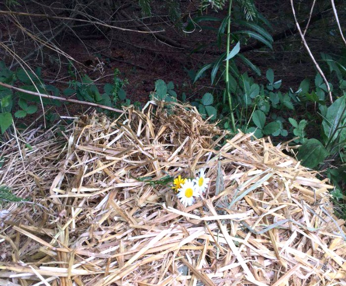Ainsi nous avons repris le chemin de cet Arbre à poules qui au fil des années en a accueilli plusieurs. J’ai déposé la poule, sur laquelle mon tout petit a souhaité déposer une fleur qu’il avait cueillie en route. Nous avons remercié la poule pour sa présence, le plaisir de l’avoir eu avec nous et tous les bons œufs qu’elle nous a offerts. Ce fut l’occasion de se souvenir de toutes les autres poules, de leurs mésaventures, de leurs couleurs, du bonheur que nous apporte ce poulailler. Avant de partir, nous avons jeté un dernier coup d’œil à ce petit monticule de paille déposé au pied d’une épinette et surmonté d’une fleur sauvage. C’était beau. Doucement, la mort s’apprivoisait, prenait une autre allure, en même temps que le cœur de mon garçon s’allégeait.