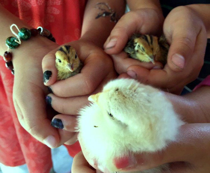 Puis nous sommes retournés voir les autres poules, les nourrir, les abreuver, les cajoler et finalement découvrir que l’une d’entre elles… était en train de couver! Cachée dans un coin, elle avait rapatrié 5 œufs, bruns, blancs et bleus sous ses ailes. Dans 21 jours, une trâlée de petits poussins allaient éclore, apportant la magie, le ravissement propre aux naissances!