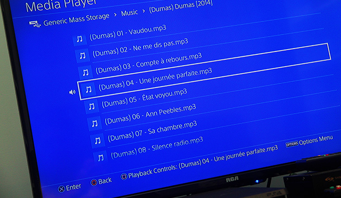 Ben là, c’est vraiment tout simple, je pense qu’il suffisait d’y penser! L’interface de la PS4 est déjà friendly à ce type d’utilisation (elle ne l’était pas au lancement, mais des modifications ont été apportées pour qu’elle le soit). Il suffit d’y connecter un disque dur externe (ou une clé USB) sur lequel on a préalablement mis le contenu auquel on veut accéder. Ensuite, sur la console, on navigue tout simplement dans les différentes sections pour accéder à notre contenu. Attention: c’est beaucoup plus facile de trouver nos choses si le contenu est à la base bien classé sur le disque dur! De plus, vous devez suivre la logique PS4… la musique doit être dans un dossier nommé “Music”, les vidéos dans un dossier nommé “Video”. Par exemple, on peut faire un répertoire pour les enfants, un pour les parents… ou même un par personne si nous avons tous des goûts différents!