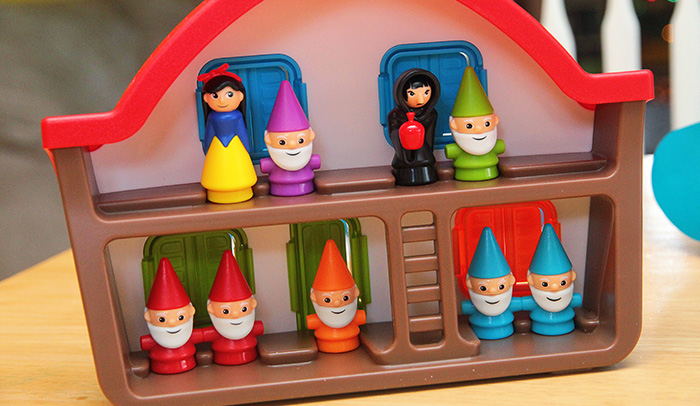 Ce jeu-là est vraiment superbe! La boîte comprend la maison de Blanche-Neige, 7 nains, Blanche-Neige et la sorcière, le livret de défi et une bande dessinée. Les enfants doivent trouver la bonne place pour chaque personnage. Il y a 24 défis intérieurs (plus faciles) et 24 défis extérieurs (plus difficiles).