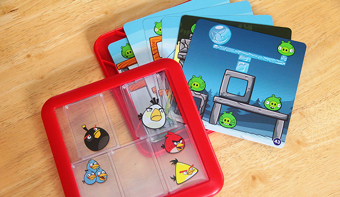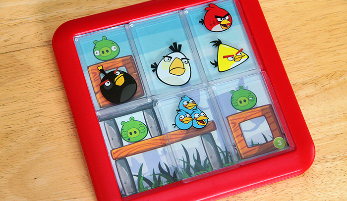 J’aime le format du jeu parce qu’il peut s’apporter un peu partout (auto, pour attendre à des rendez-vous, etc). Le joueur doit déplacer des pièces coulissantes pour bien placer les oiseaux sur les cochons. Le jeu comprend 48 défis.