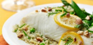 Flétan au citron avec quinoa, beurre et légumes printaniers